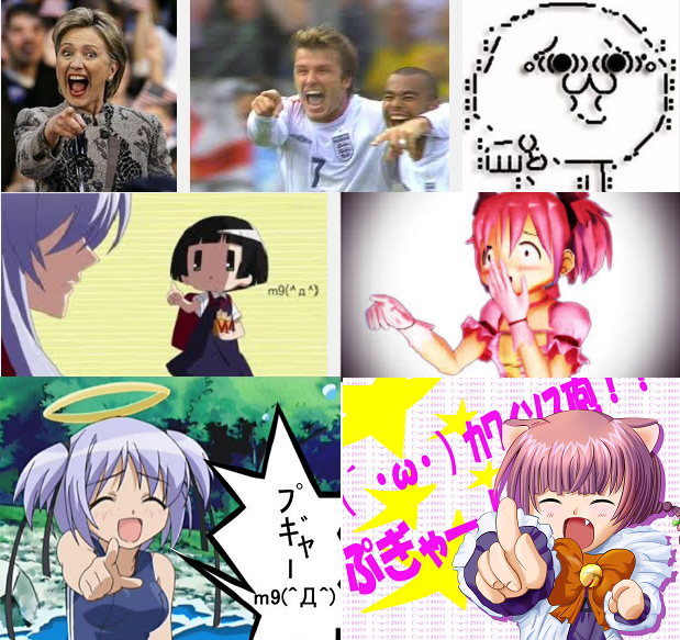 88東 西 南 北◆932uJsG3gE2016/11/05(Sat) 16:02:16ID:IzNDU2NjU(30/33)NG報告「ぷぎゃー/プギャー」(pu-gya-a)画像の中にも、書かれている、2ちゃんねる発祥の顔文字"m9(^Д^)"が元ネタ。画像を見れば想像が着くと思うが、某所の”解説”を転載。---相手を”罵倒(けなす)”しつつ嘲笑う用途であるが、あまりにも多用されているため、ある程度の 「温かさ」 がある。だが、マジで凹む人もいるため、空気を読んで使うことを注意しよう。3