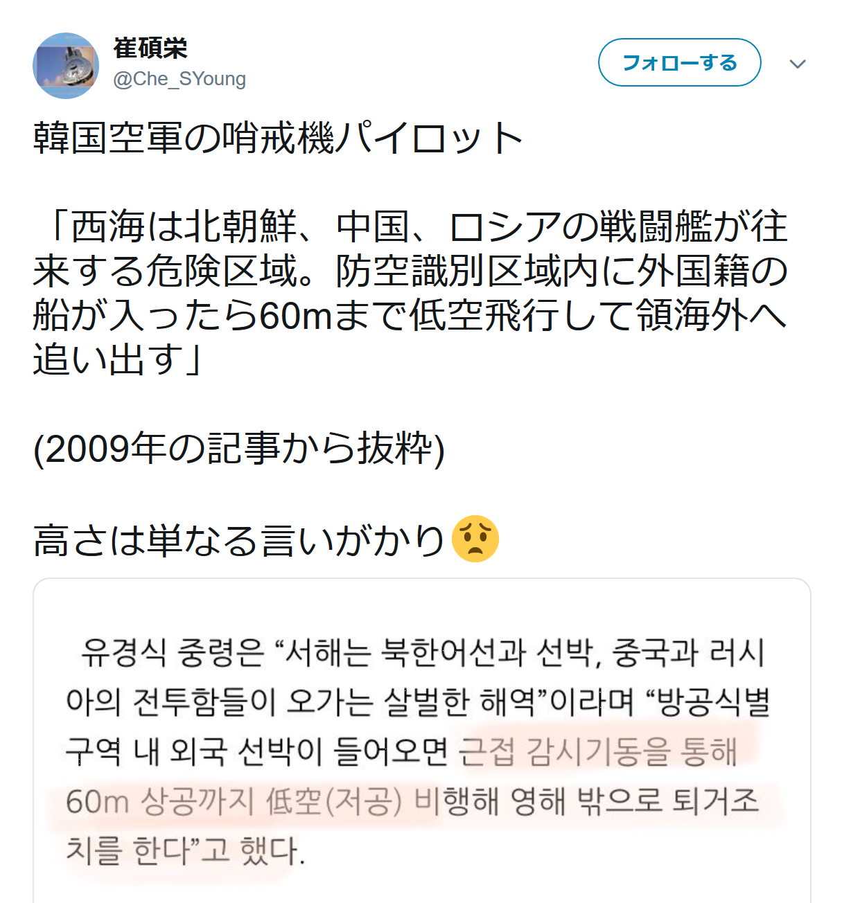 韓国空軍パイロット「防空識別区域内に外国籍の船が入ったら60mまで低空飛行して領海外へ追い出す」」