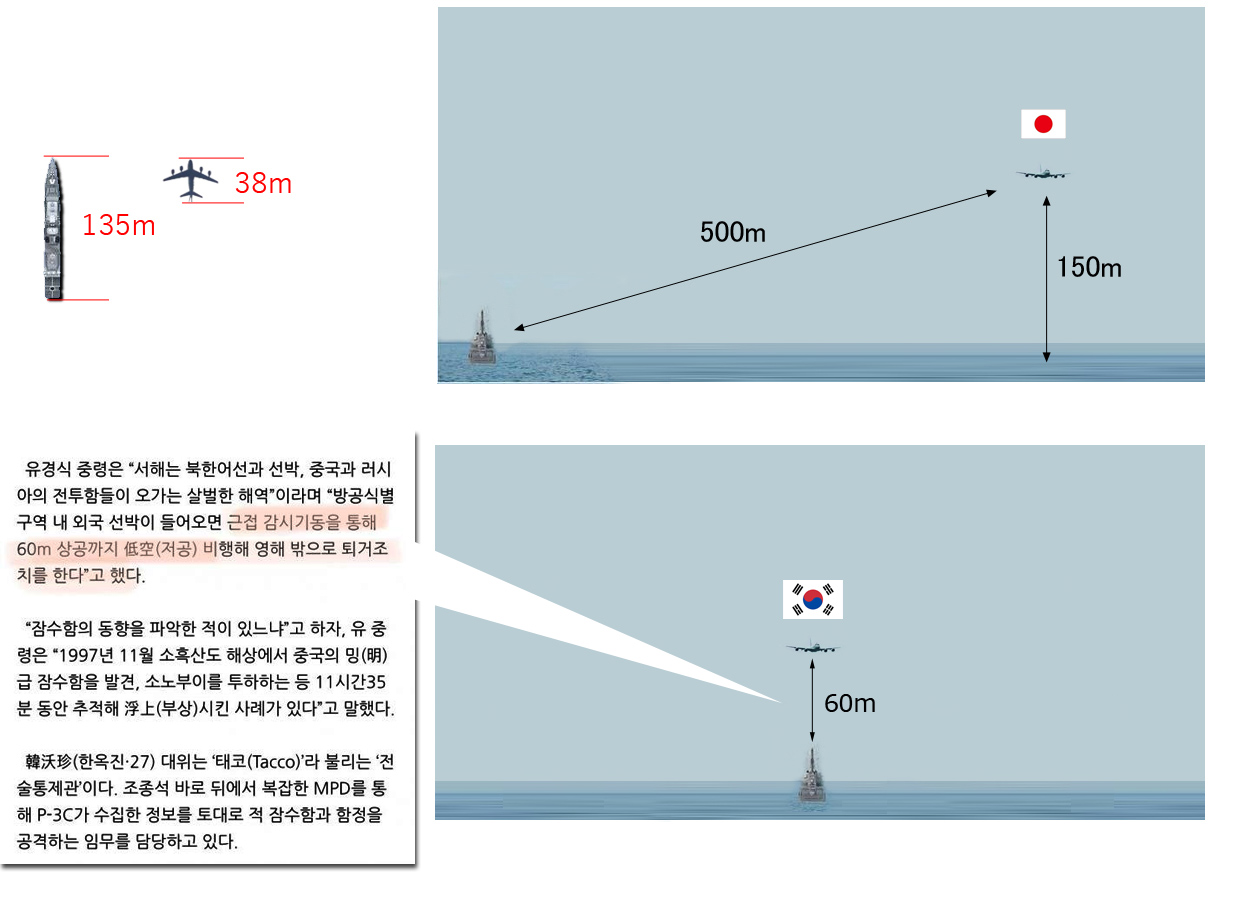《韓国海軍は、P-1哨戒機とほぼ同様の運用をしているP-3哨戒機を保有していますが、韓国メディア「月刊朝鮮」の記者が2013年7月10日にこのP-3へ搭乗取材した記事によると、「目視識別のために高度を100mまで下げた」「外国の艦艇監視のため高度60mで接近飛行する」とあり、韓国海軍の哨戒機部隊自身が外国の艦艇に対して、今回の事件におけるP-1よりもはるかに低い高度を飛んでいることが分かります。》