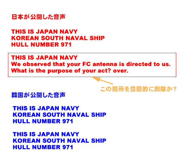 前者はアホとしか言いようがないですし、後者は聞き手の耳か頭が腐っていたのだということがわかります。映像については、確かテレビのコメンテーターが「海軍船は古いから映像データを残せないかもしれない。海軍からの映像データがないのは、それが記録として残っていないからかもしれない」みたいなことをいってました。