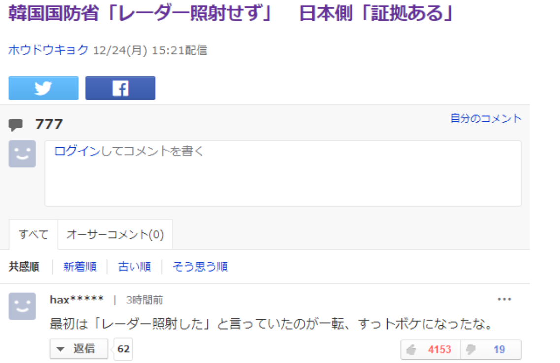 日本の報道で乱しを短くする為に焦点のFCRに絞って「レーダー照射無かった」と報じてるだけで、この報道の中身で誤解を招く書きぶりは無いし、日本のメディアでここを誤解させる報道は皆無なのに、コイツはそこら辺の検証もせずに日本が歪曲してると言い続けてる。