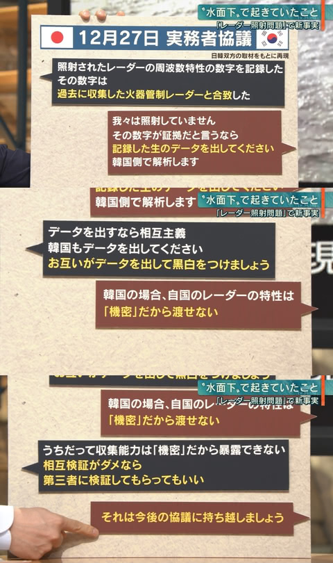 この軍事関係筋によれば、日本側は昨年12月27日にテレビ会議の形で行った日韓防衛当局の実務協議などで、日本の哨戒機が受けたレーダーと、韓国艦艇のレーダーの周波数などのデータを交換して照合することを提案したという。韓国側は、照射の事実はないとしつつ、軍事機密にあたるデータ提供に難色を示したという。