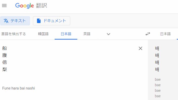 https://translate.google.co.jp/?hl=ja&tab=wT#view=home&op=translate&sl=ja&tl=ko&text=%E8%85%B9%20%EF%BC%9D%20%EB%B0%B0%20%20(belly)%0A%E8%88%B9%20%EF%BC%9D%20%EB%B0%B0%20%20(ship)%0A%E6%A2%A8%20%EF%BC%9D%20%EB%B0%B0%20%20(pear)