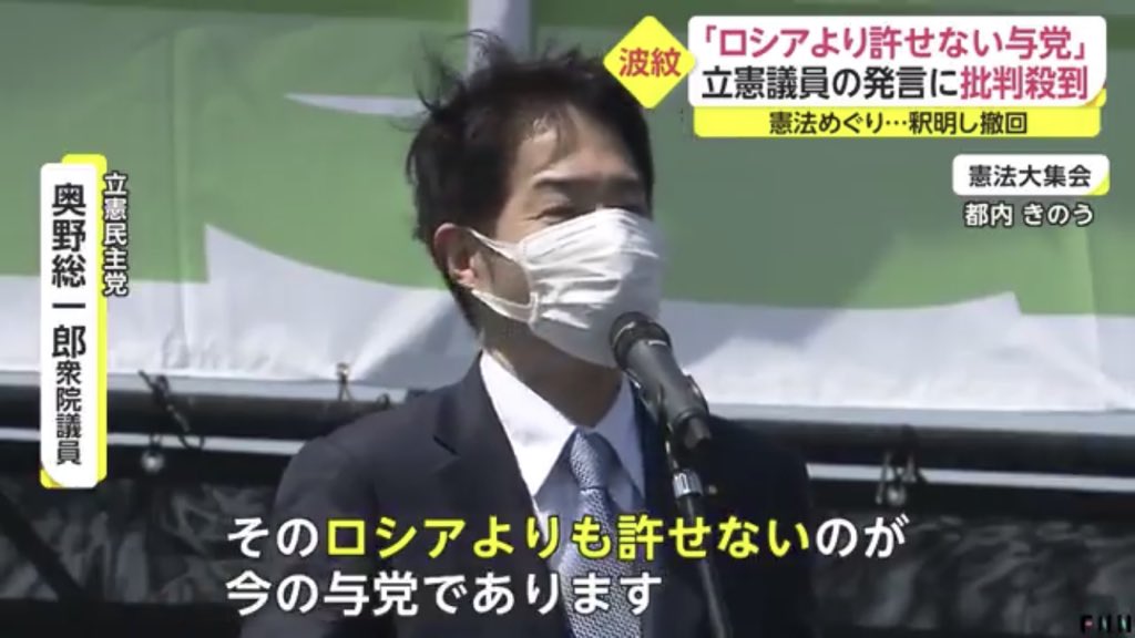 奥野氏は憲法記念日のこの日、都内で行われた憲法集会で与党に対して「ロシアよりも許せない」と批判。「ウクライナ問題をだしにして」と、どさくさ紛れに改憲に踏み切ろうとしていると発言したことが報じられた。