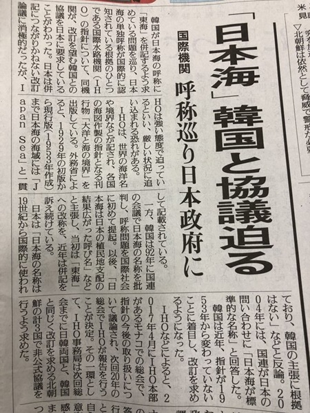 【日本海呼称「韓国と協議を」国際機関が強く要求】読売新聞 2019年01月18日 17時45分