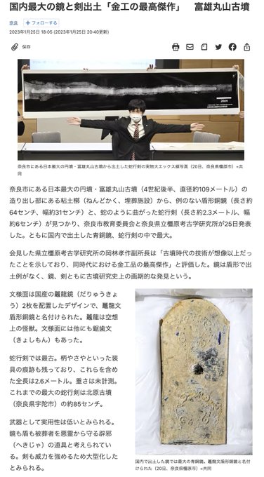 何より、アケチが別人として二人(阿奇支・明智)も登場しますし(笑)国内初確認の「盾形銅鏡」と国内最大2m超「蛇行剣」の鉄剣出土…古墳時代の金属工芸「最高傑作」