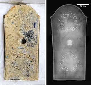 文様面は国産の鼉龍鏡(だりゅうきょう)2枚を配置したデザインで、鼉龍文盾形銅鏡と名付けられた。鼉龍は空想上の怪獣。文様面には他にも鋸歯文(きょしもん)もあった。