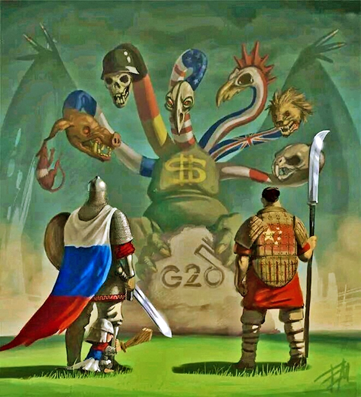 米英仏加豪日の国際監視団からの監視。絵の主は、G7に陰謀論的な悪意を持ってると感じるよね。