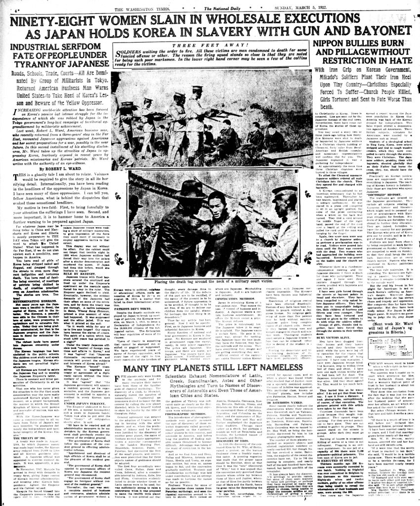 2년 전 일본인들은 조선에 거주하는 자국민에게 미국이 조선 독립 요구의 배후라는 보고서를 뿌렸다. 이 허위 보고서로 인해 모든 미국인들에 대한 반대 시위가 촉발됐다. 미국인으로 오해 받은 영국인 3명이 서울에서 일본인 무리에게 시달렸다.