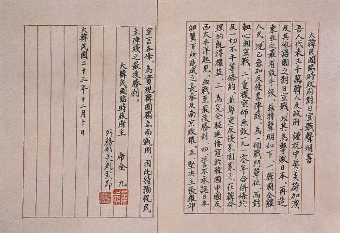 大韓民国臨時政府は1941年12月10日、日本がハワイ真珠湾を攻撃して太平洋戦争を起こすと、日本に対する宣戦布告文「対日宣戦声明書」を発表した。