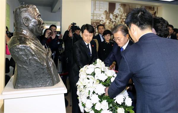 日本の植民地時代に抗日拠点だった「大韓民国臨時政府」庁舎の跡地を訪れ、献花する韓国の文在寅大統領>>2