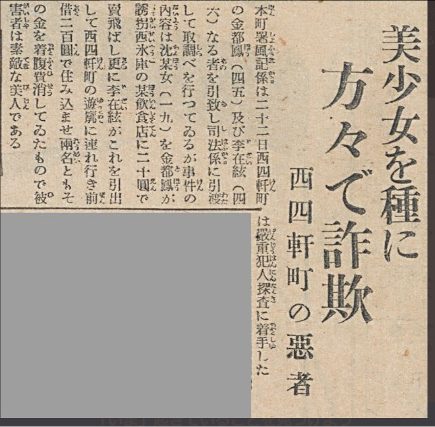 朝鮮で19歳の朝鮮人少女を誘拐し、飲食店に20円で売り飛ばし、さらに同じ少女を遊郭に前借金200円で住み込ませて金を着服していた朝鮮人2名が検挙されたという記事。