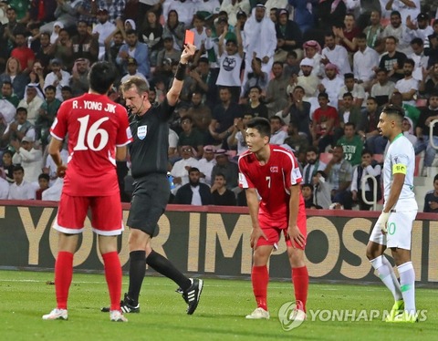 ▼サウジ戦でレッドカードを受ける北朝鮮のハン・グァンソ北のしもべのムンが立て替えするのか?w