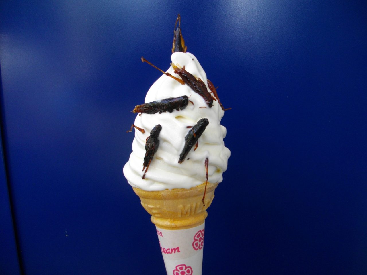 長野県諏訪湖の観光遊覧船のところで売っているイナゴの佃煮を使ったバッタソフトクリーム。爽バニラが好き
