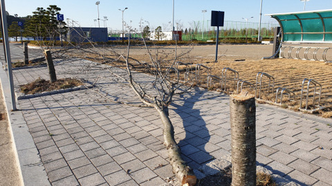 順天(スンチョン)市内ヨンヒャン第3地区、生態文学教育園近くの人工芝サッカー場とインラインスケート場一帯に植えられた15年生の桜の木とヒトツバタゴ28本が、市民Aさん(48)によってばっさりと切り倒された。