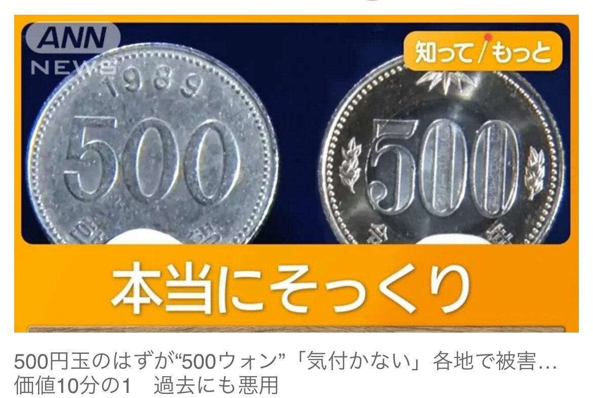 皆さんも、財布の中を確認したほうがいいかもしれません。各地で「500円玉」ではなく、不正に使われた「500ウォン玉」が紛れ込む事態が相次いでいます。(以下はソースで