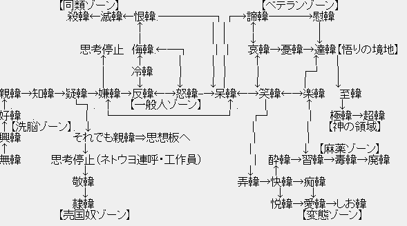 親韓→知韓→疑韓→嫌韓→反韓←→怒韓-→呆韓←→笑韓←→楽韓 至韓