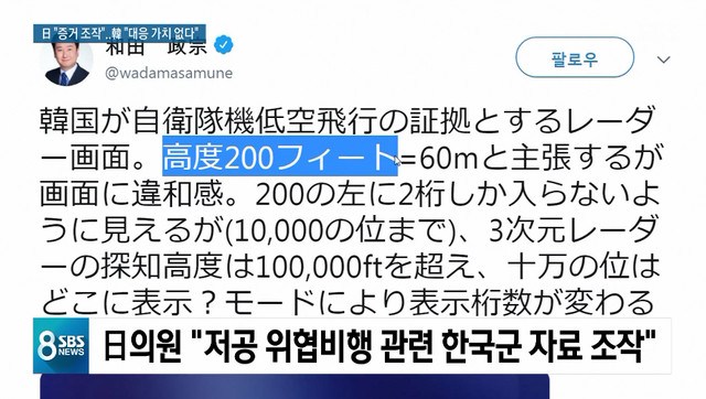 元NHKのアナウンサーで自民党の和田政宗議員がSNSに投稿した文と写真です。日本の哨戒機の低空威嚇飛行と関連して、我が軍が出した資料が捏造であるという内容です。200という数字と単位であるフィートの間に空間があるとし、我が軍が意図的に0を一つ消したというのです。