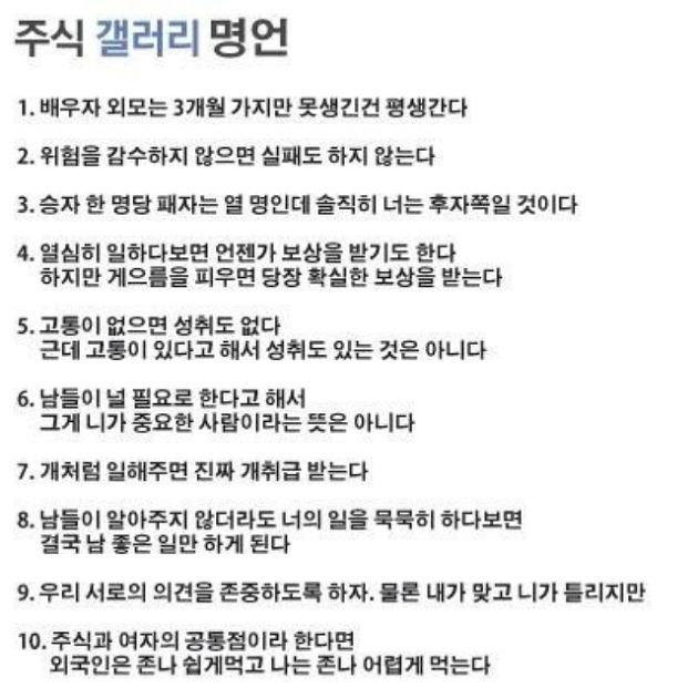 10. 주식과 여자의 공통점은 외국인은 쉽게 먹고 나는 어렵게 먹는다는 점이다.備えあれば憂い無し