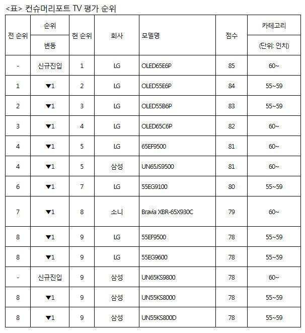 1名無し2016/11/02(Wed) 13:12:50ID:M1NDE1MjY(1/19)NG報告1위 LG2위 LG3위 LG4위 LG5위 LG6위 삼성7위 소니 덧붙여 일본제 소니 TV도 품질 평가에서 7위를 기록 했네요 ^ ^축하합니다>>31>>50>>91>>921