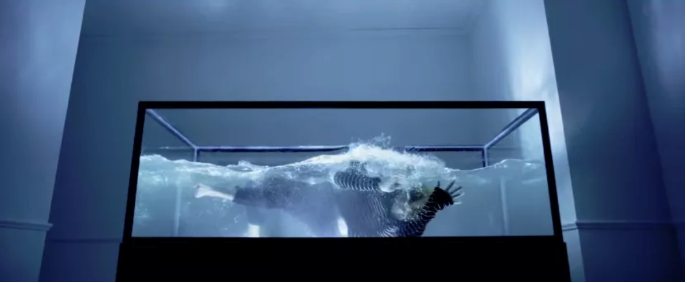 その映像では、水槽の中でもがき苦しみ、動かなくなるシーンがあります。