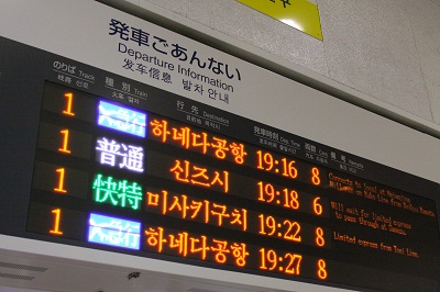 多くの駅や電車で採用されている「行き先表示」パネルには、日本語と英語以外にも、中国語や韓国語での案内が掲示されている。