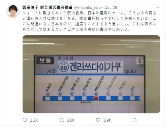 日本にいる朝鮮人が文句付けそう自身のTwitterに電車内のハングル表記の画面を掲載して、「日本の電車内でこういうのを見ると悲しくて不快になる」とし、「ここは間違いなく日本なのに、過度なことをするなと言いたい」とツイートした。また、「日本に来る者は辞書を持って来い」と付け加えた。