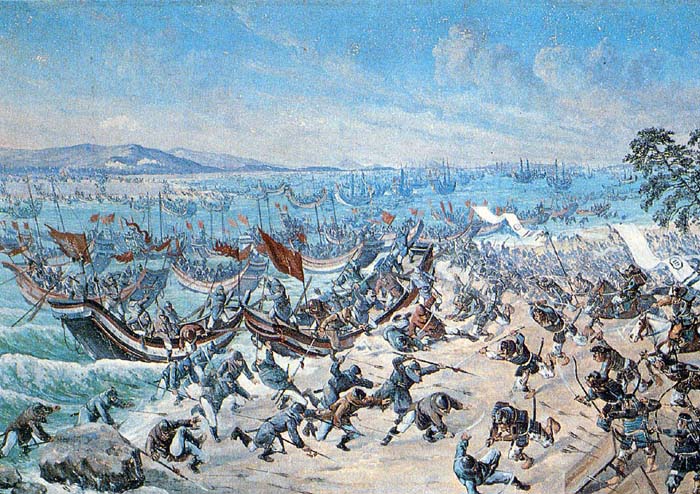 そもそも日本に上陸して陸上に拠点確保出来ず船に乗っていたから台風で被害が拡大したわけなんだが、話が本末転倒している。