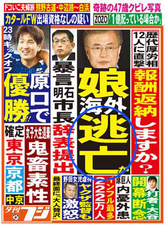 [イーデイリーバクジヒェ記者]極右性向の日本産経新聞系列夕刊フジが2日付1面に「ムン・ジェイン大統領の娘、海外逃亡(逃亡)」と掲載した。