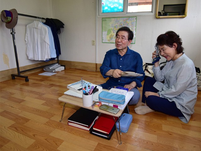 朴市長が過ごすのは、30.2平方メートルの広さに2部屋。朴市長が1部屋を使い、秘書官2人が残りの部屋で過ごす。2部屋ともエアコンなしで、扇風機を1台ずつ置いた。住民との対面の場に同席した朴市長の妻カン・ナンヒ氏は、「朴市長は普段あまり汗をかかないのに、今日はすごい汗」と話した。