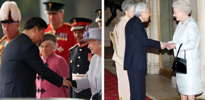 【2015年】天皇陛下とは素手で握手をなされるエリザベス女王が習近平とは手袋をされたまま握手をし『平民』扱いをされました