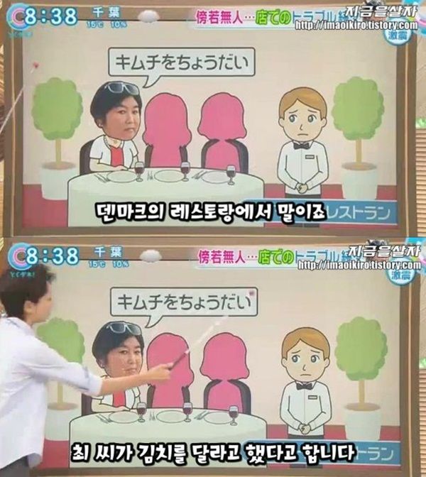 番組のアナウンサーは、「デンマークのレストランで催順実氏がキムチをちょうだいと言った」とし、絵と一緒に説明した。
