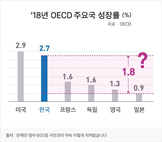 지난해 한국의 경제성장률은 2.7%, 일본은 0.9%였다. 성장률은 한국이 일본의 3배지만 막대 그래프에선 약 5배 이상으로 보인다. 심지어 프랑스와 독일은 성장률이 1.6%로 같은데도 막대 높이가 다르다. 숫자를 입력해 나온 그래프를 그대로 썼다면 있을 수 없는 일이다. 인위적으로 높이를 조정했다는 의미다.