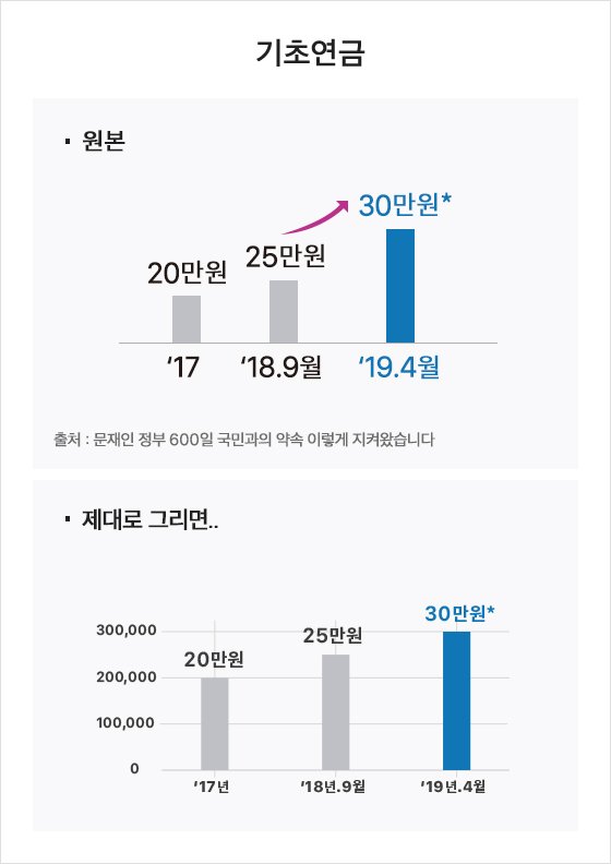基礎年金は、2017〜2018年には、2018〜2019年同様に5万ウォンずつ上がった。基礎年金が2年、新しい20万ウォンから30万ウォンに10万ウォン上昇したが、グラフは2倍に上がったかのように描いた。