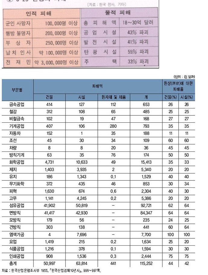 맨 위에 있는 6.25 전쟁 피해 표를 보면 공업 시설 43% 파괴. 발전 시설 41% 파괴. 탄광 시설 55% 파괴 주택 33% 파괴다.