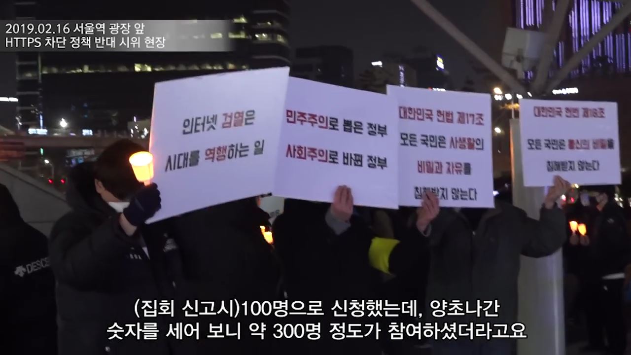参加者が持っているプラカードには「ネットの検閲は時代に逆行している」、「民主主義を選んだ政府が社会主義に変わった」、「大韓民国憲法第17条 すべての国民を私生活の秘密と自由を侵害されない」などと書かれていた。