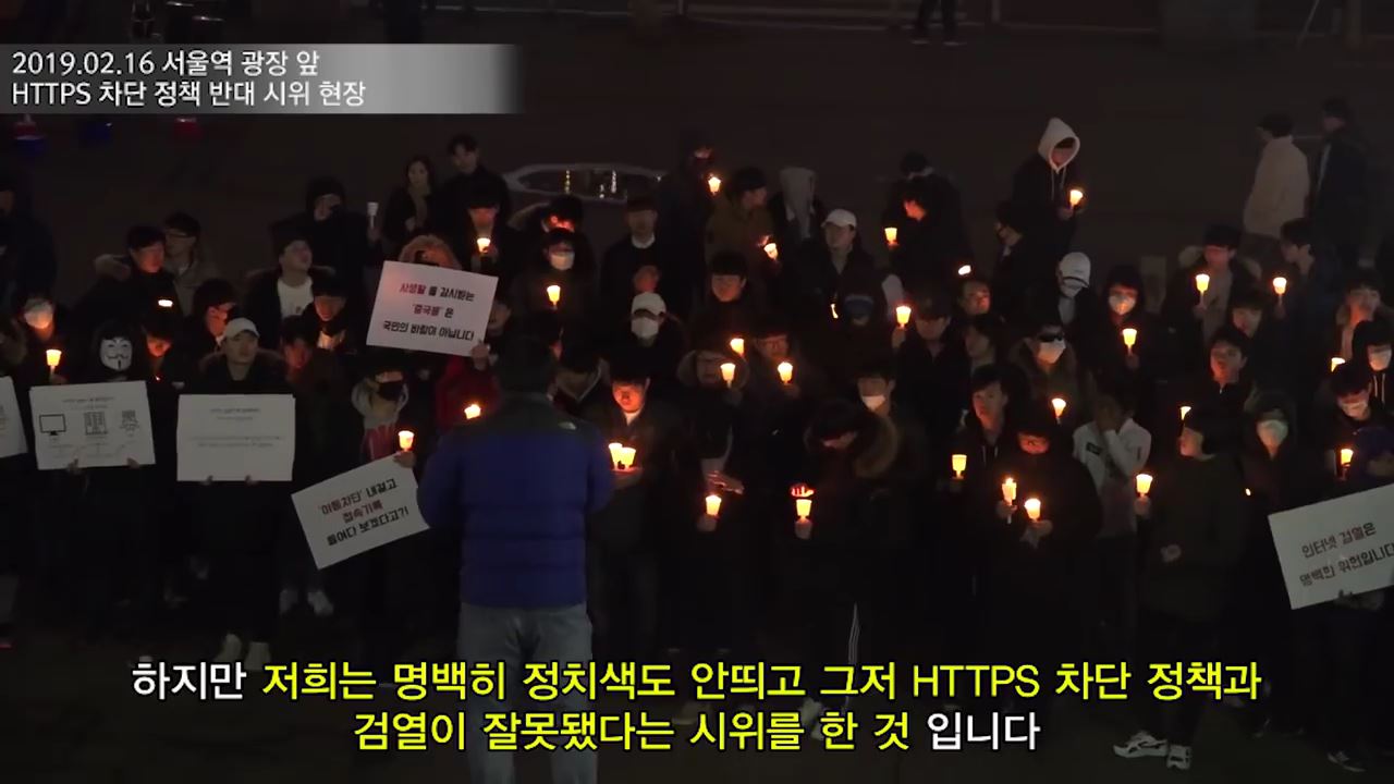 この日の「ろうそく集会」はユーチューバーである「チャンウバク」の主催により行われたもので、集会の参加者はろうそくを持って一人ずつ自由に発言しながら政府のウェブサイト遮断および検閲に対する反対を叫んだ。