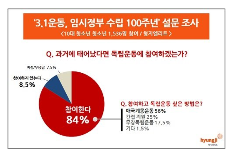 当該アンケートは,ヒョンジエリートが10代の青少年1536人を対象に,1月9日から17日までホームページとSNSで行いました。 "過去に生まれたら独立運動に参加するか"との質問に84%が"参加した"と答え,8.5%は"参加しない",7%は"知らない"と答えました。独立運動について学習した経路としては,教科書·授業(66%)が最も高かった。 映画(14.5%),歴史体験(8%),ドラマ(3.5%)が相次ぎ,教科の授業以外のコンテンツによる学習比重も頻繁だという結果が確認されました。 このようにコンテンツを通じて出会う独立運動は,大衆に遠くばかり感じていた歴史の中の物語を再照明させ,痛い現実として自覚させます。>>1