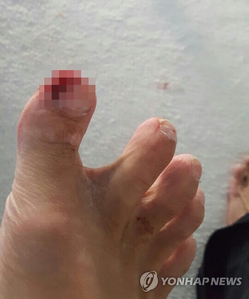 (ソウル=聯合ニュース)21日趙顕娥前の航空副社長の夫パク某氏が公開した2016年3月組元副社長の暴行の痕跡。