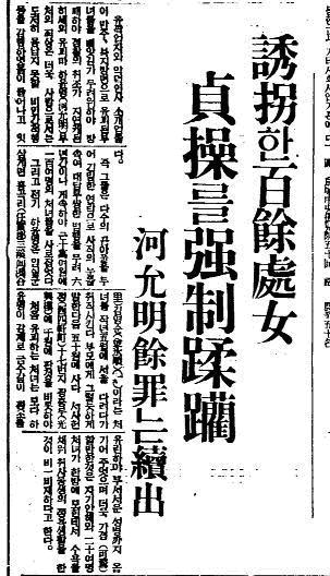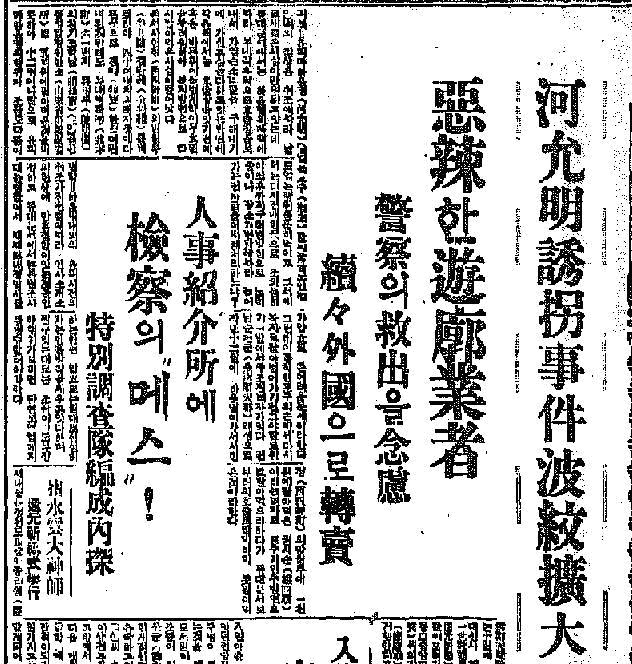 「河允明誘拐事件波紋拡大」、「悪辣な遊郭業者」、「警察の救出を念慮」、「続々と外国に転売」といった見出しに続き「人事紹介所に検察のメス!」、「特別調査隊編成内探」