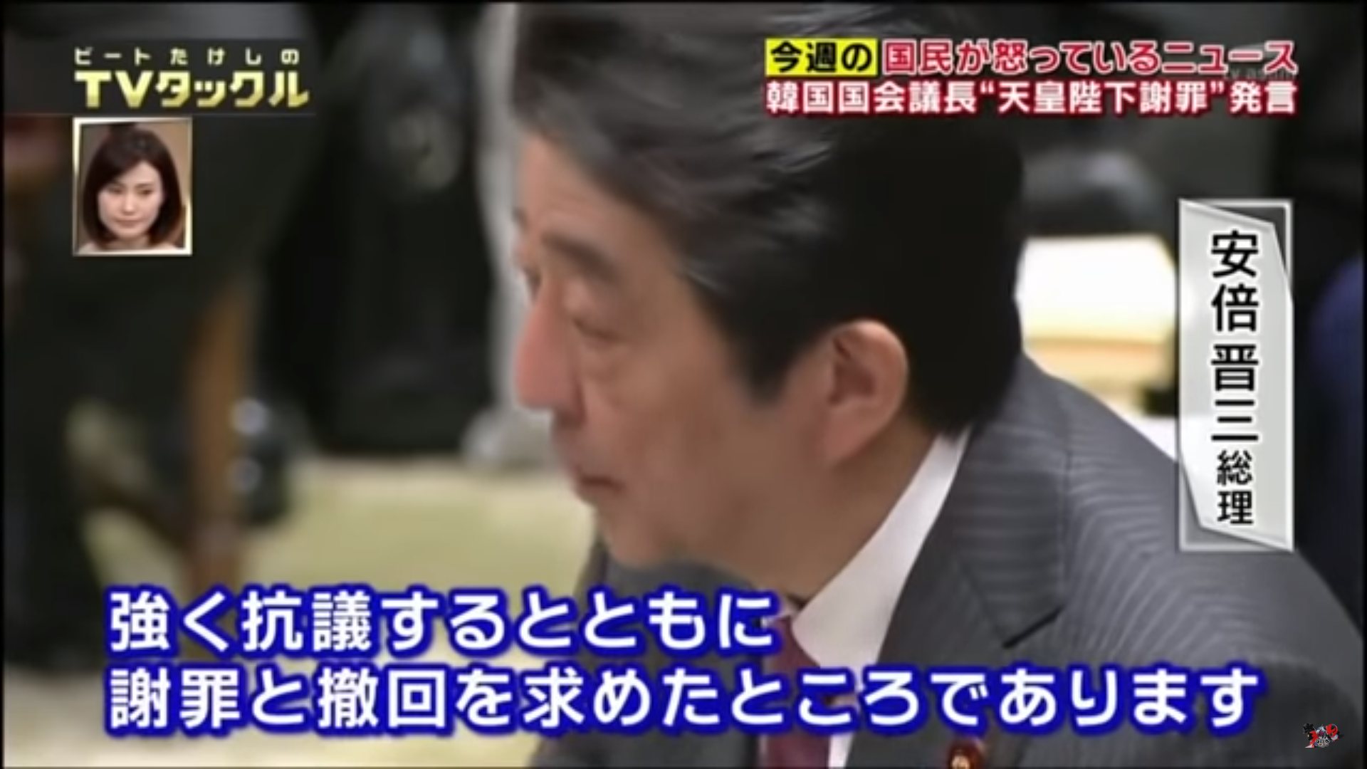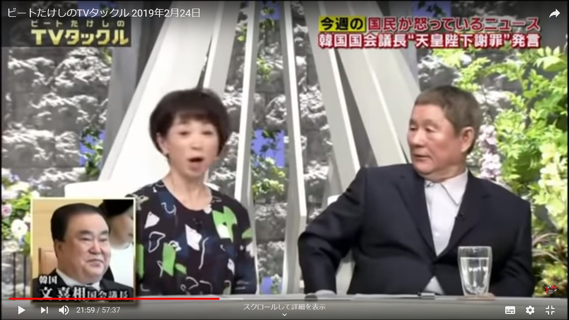 ビートたけしは24日、放送されたテレビ朝日の政治対談番組『ビートたけしのTVタックル』『今週の国民が怒っているニュース』のコーナーで最近、日本国内で議論となっている文議長に関連したニュースを扱った。
