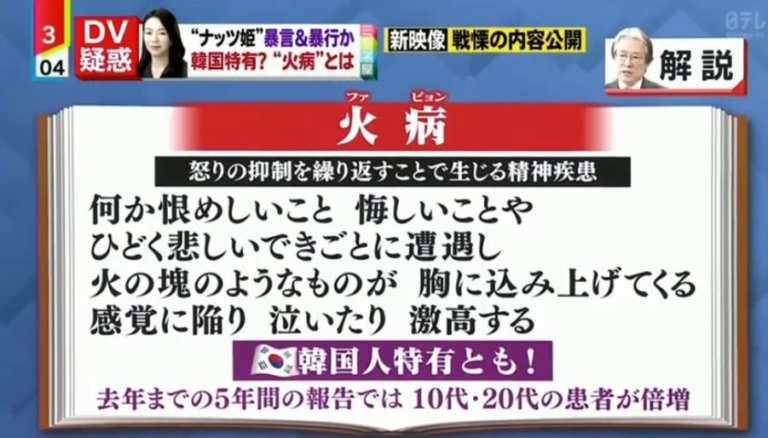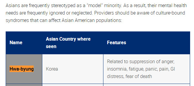 ”韓国のみに存在する文化固有の障害であり、米国精神医学会で発表した精神疾患の診断と統計マニュアル書籍であるDSM(Diagnostic and Statistical Manual of Mental Disorders)では、病名を韓国表記でHwa-Byung(つぼと同音)と公式登録した。”