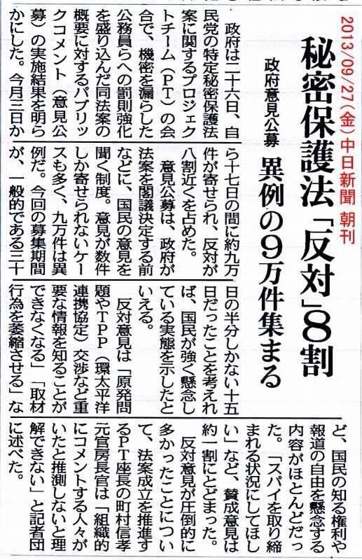 (47NEWS 「秘密法「修正・廃止を」が82% 内閣支持率急落47%」2013/12/09 18:38)
