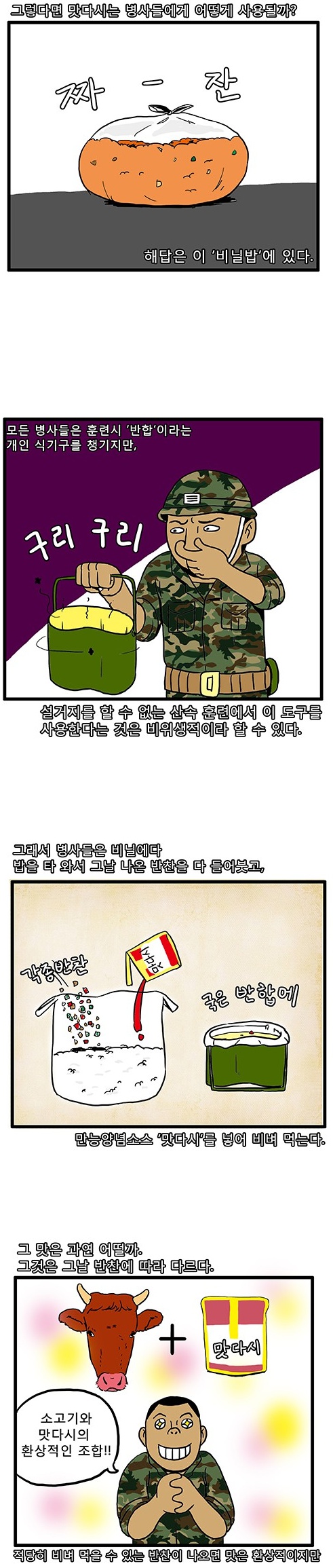 4번- 소고기와 조미료는 환상의 조합.... 으로 표시되어 있으며 군인이 행복합니다.