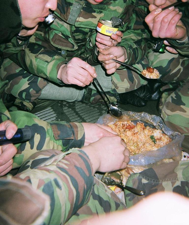 3번- 군인은 수지에 백색 밥을 수령하고, 다수 반찬을 혼합하고.... '위 조미료'를 투하합니다.