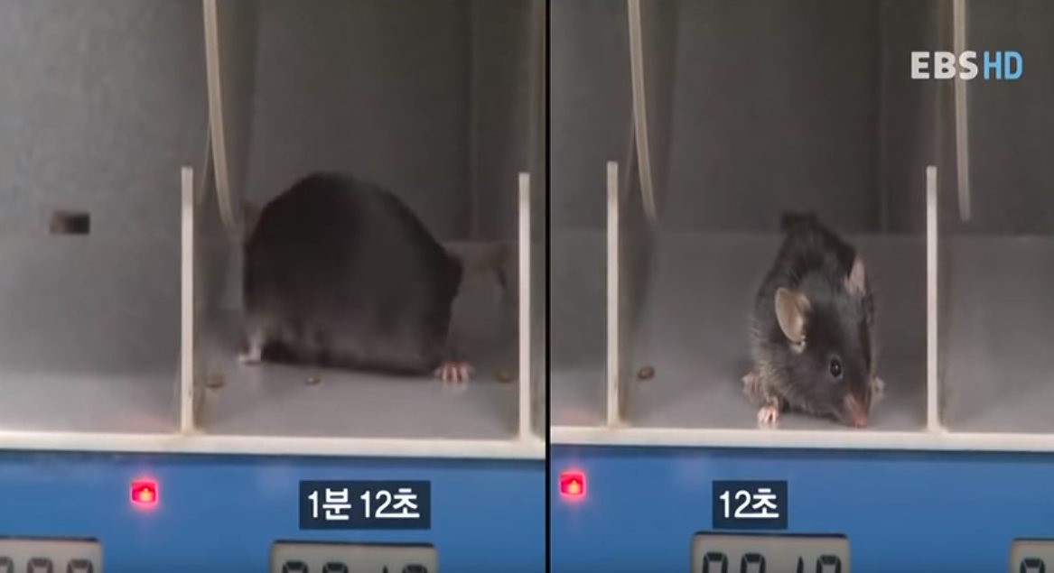 오른쪽은 회전하는 원통에서 바로 추락하지만, 왼쪽 쥐는 회전하는 원통을 한참 질주한다.