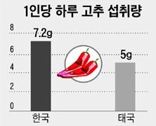 도표는 '1인당 하루 고추 섭취량'으로 우측 도표가 '태국'이다. 고추 소비량 세계 3위에 언급된 국가이다.