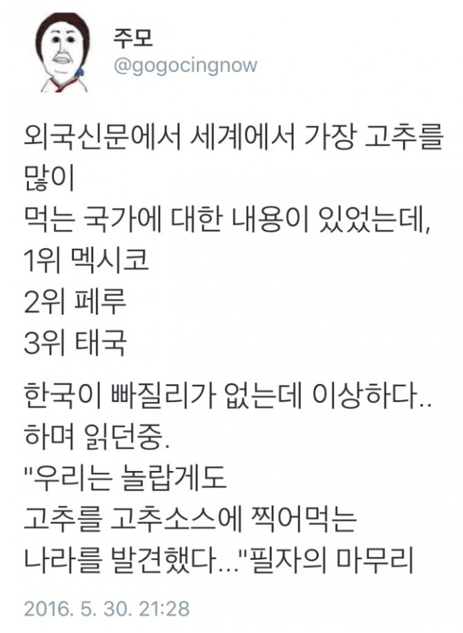 (번역) 외국신문에서 '세계에서 가장 고추를 많이 먹는 국가에 대한 내용이 있었다.'