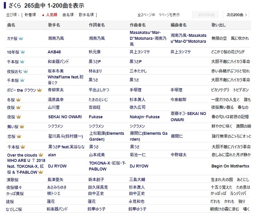 読みが「ざくら」と濁るものを別に検索したところ、265曲。