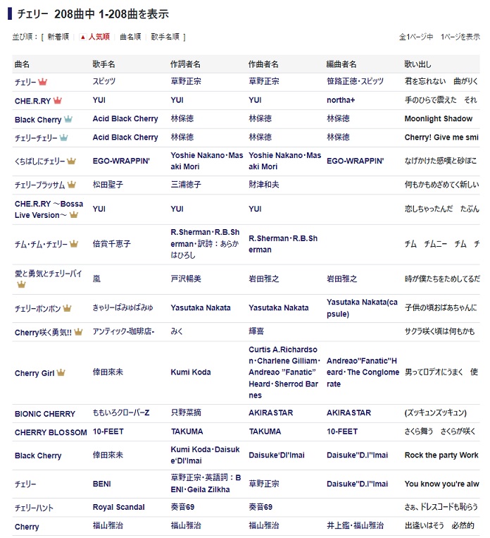 「チェリー」での検索結果は 208曲。